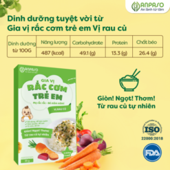 Gia vị rắc cơm rau củ: Rong biển, khoai lang, củ dền, cà rốt, khoai tây, bí đỏ, củ cải,mè rang, dừa tươi, cỏ lúa mì, giấm, đường, muối, chiết xuất nấm men.