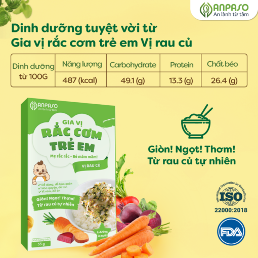 Gia vị rắc cơm Anpaso với thành phần hoàn toàn lành tính từ các loại rau củ quả, thịt cá biển tự nhiên và rong biển giàu dinh dưỡng giúp bổ sung hương vị cho món ăn, gia tăng vị giác tự nhiên của trẻ trong giai đoạn nâng cấp hành vi ăn, khám phá những mùi vị mới.